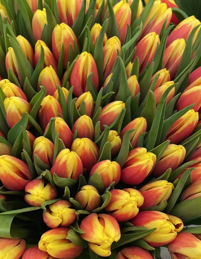 50 свежих тюльпанов одного сорта в транспортировочной бумаге — ровно столько, сколько нужно для большого букета или оформления. Цветы приехали прямо с плантации и не подвергались флористической обработке: с листьями, без подрезки и без отпаивания.
