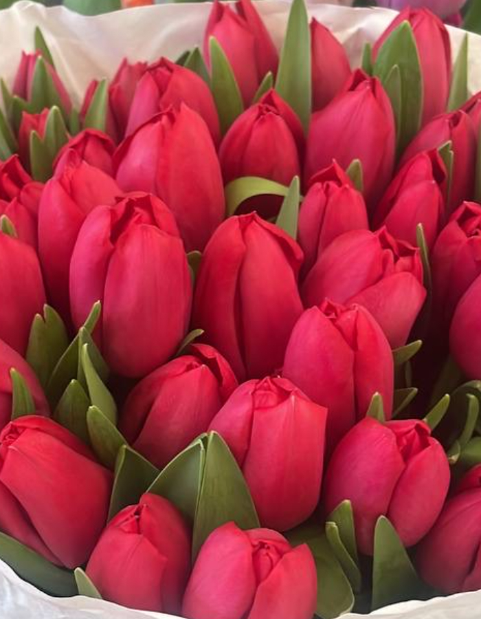 100 свежих тюльпанов одного сорта в транспортировочной бумаге. Объём, который уже чувствуется: для пышных композиций, оформления пространства или цветочных подарков коллегам и партнёрам.