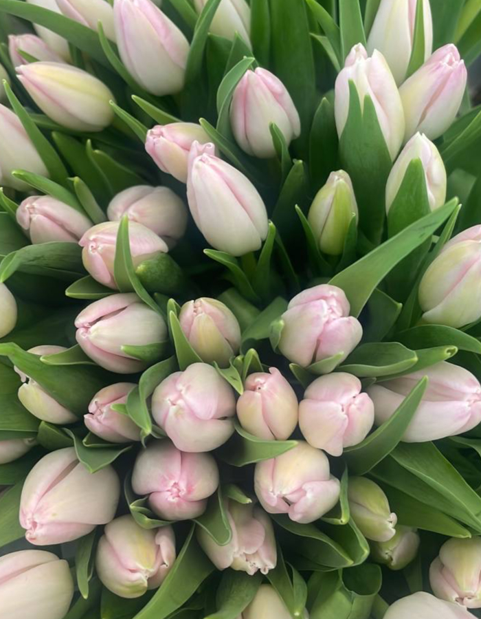 50 свежих тюльпанов одного сорта в транспортировочной бумаге — ровно столько, сколько нужно для большого букета или оформления. Цветы приехали прямо с плантации и не подвергались флористической обработке: с листьями, без подрезки и без отпаивания.