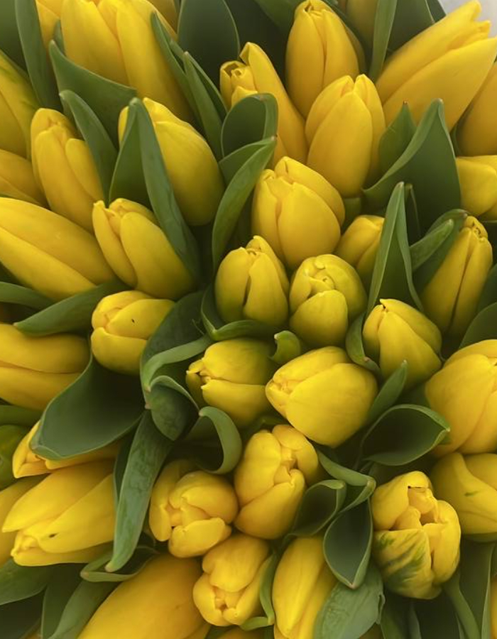 50 свежих тюльпанов одного сорта в транспортировочной бумаге — ровно столько, сколько нужно для большого букета или оформления. Цветы приехали прямо с плантации и не подвергались флористической обработке: с листьями, без подрезки и без отпаивания.