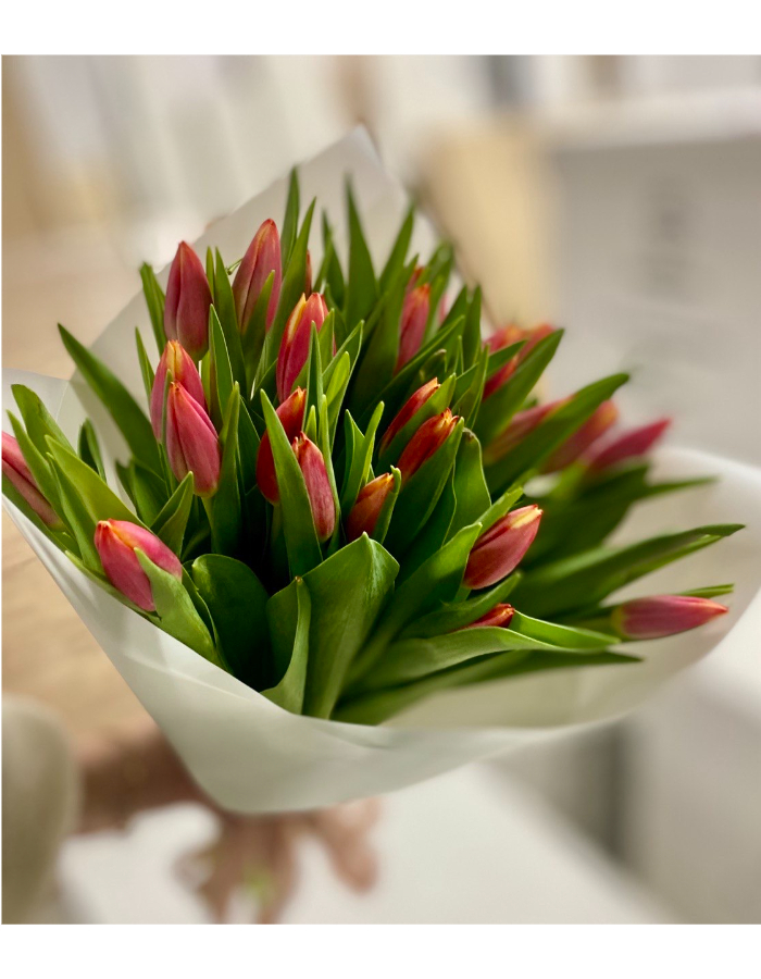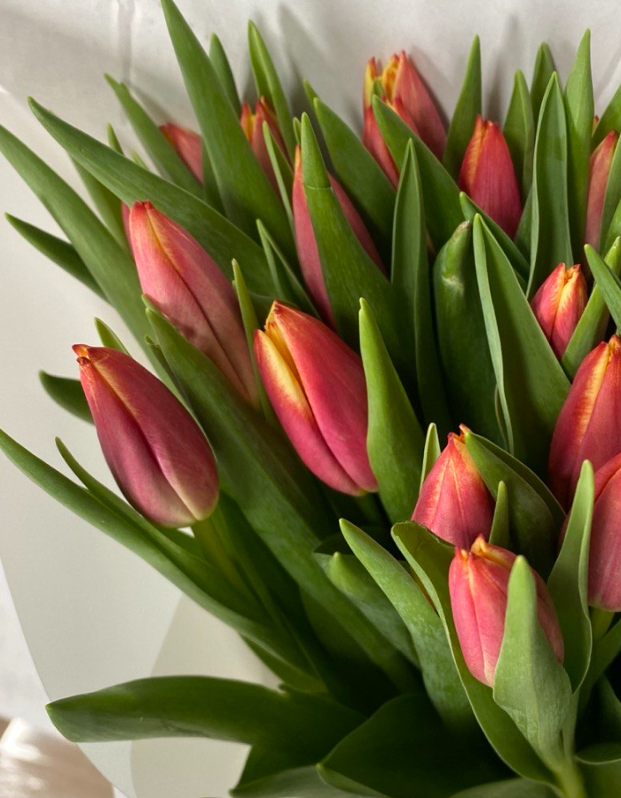 25 свежих тюльпанов с нежным переходом от розового к жёлтому — букет, который выглядит мягко, солнечно и очень по-весеннему. Лёгкая белая упаковка подчёркивает чистоту оттенков и делает композицию воздушной.