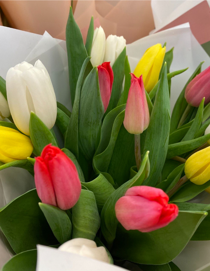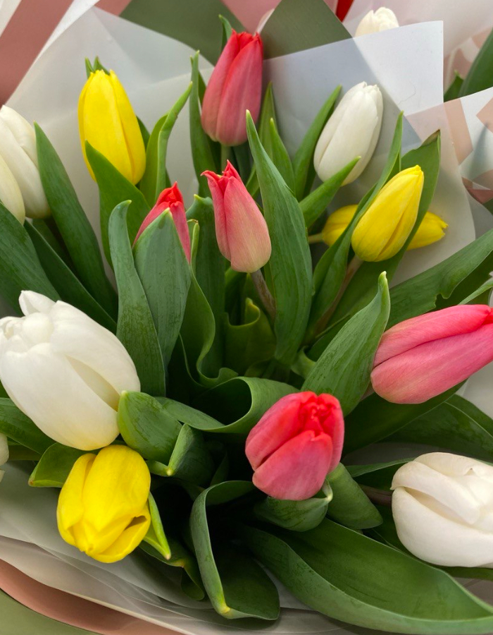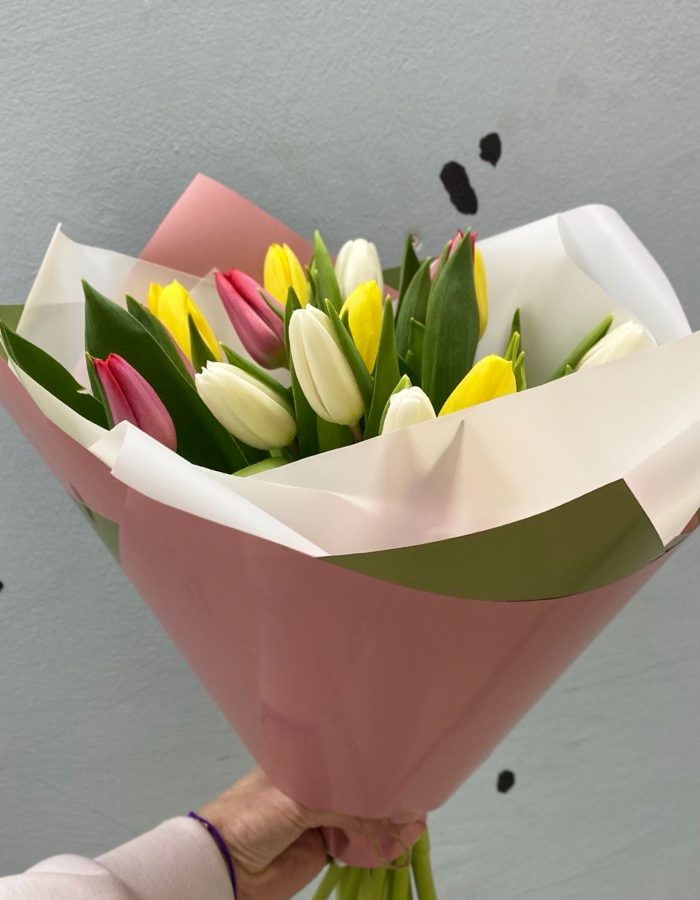 15 свежих тюльпанов в нежной весенней палитре: белые, жёлтые и розовые бутоны собираются в лёгкий, радостный букет. Сочетание оттенков напоминает первые цветы после долгой зимы — свежо, тепло и очень по-настоящему.