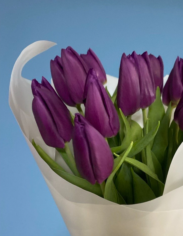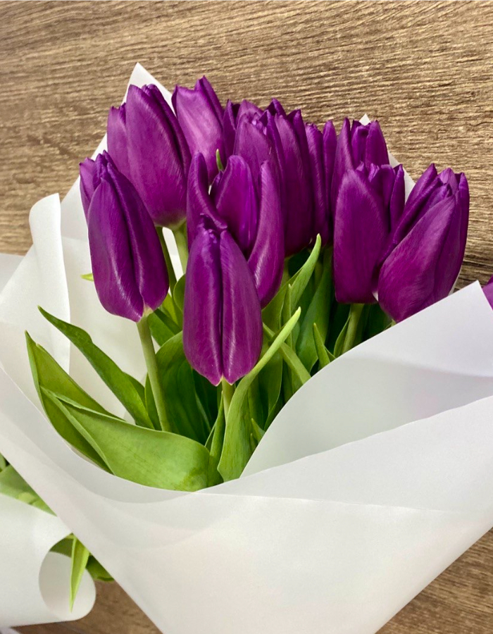 15 свежих фиолетовых тюльпанов — аккуратный, выразительный букет с благородным оттенком. Насыщенный цвет бутонов красиво смотрится в композиции и привлекает внимание.