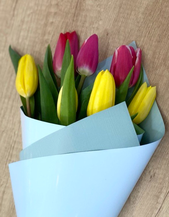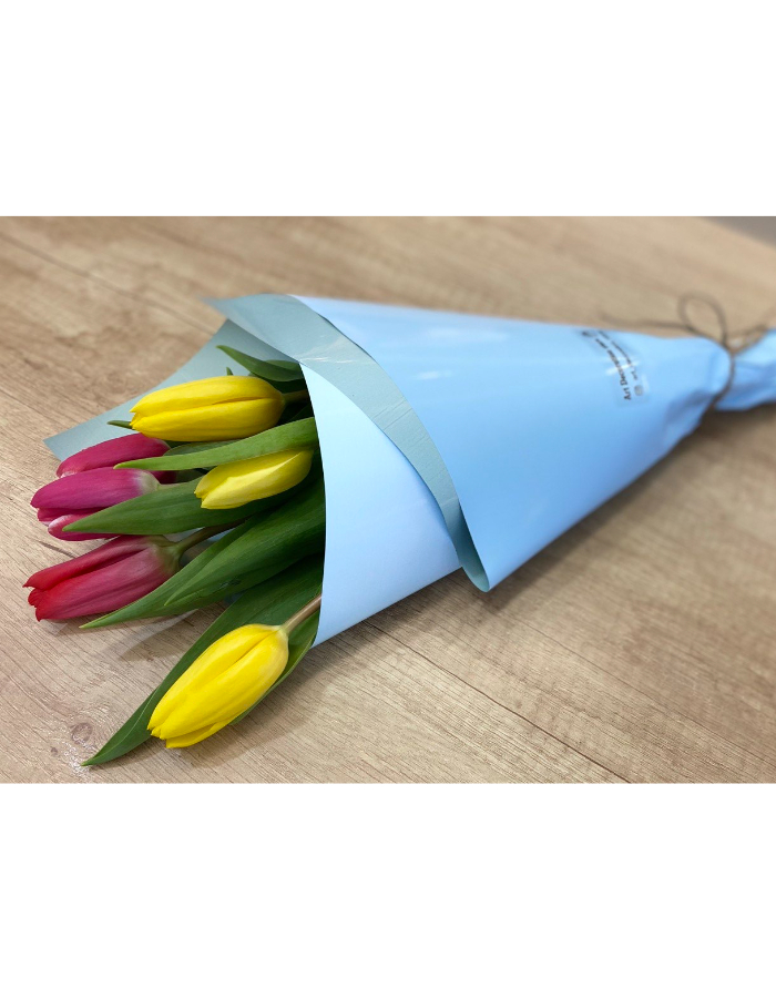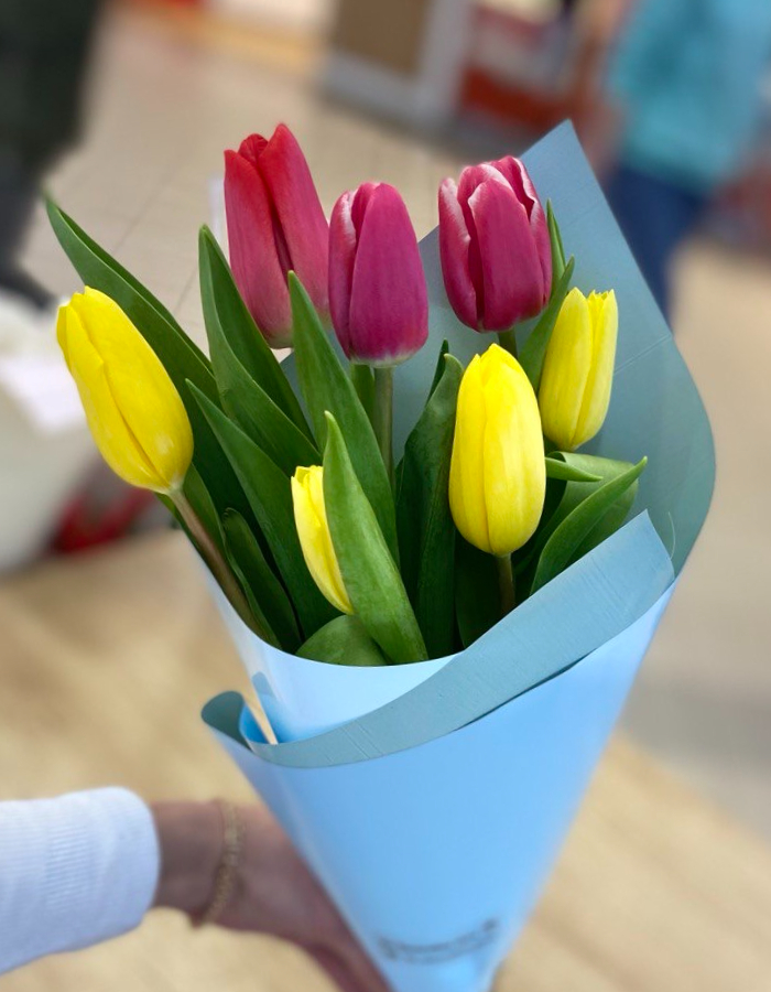 7 свежих тюльпанов в ярком праздничном сочетании: солнечные жёлтые и насыщенные красные бутоны собираются в небольшой, но выразительный букет. Контраст цветов делает композицию живой и энергичной — идеально для тёплого поздравления.